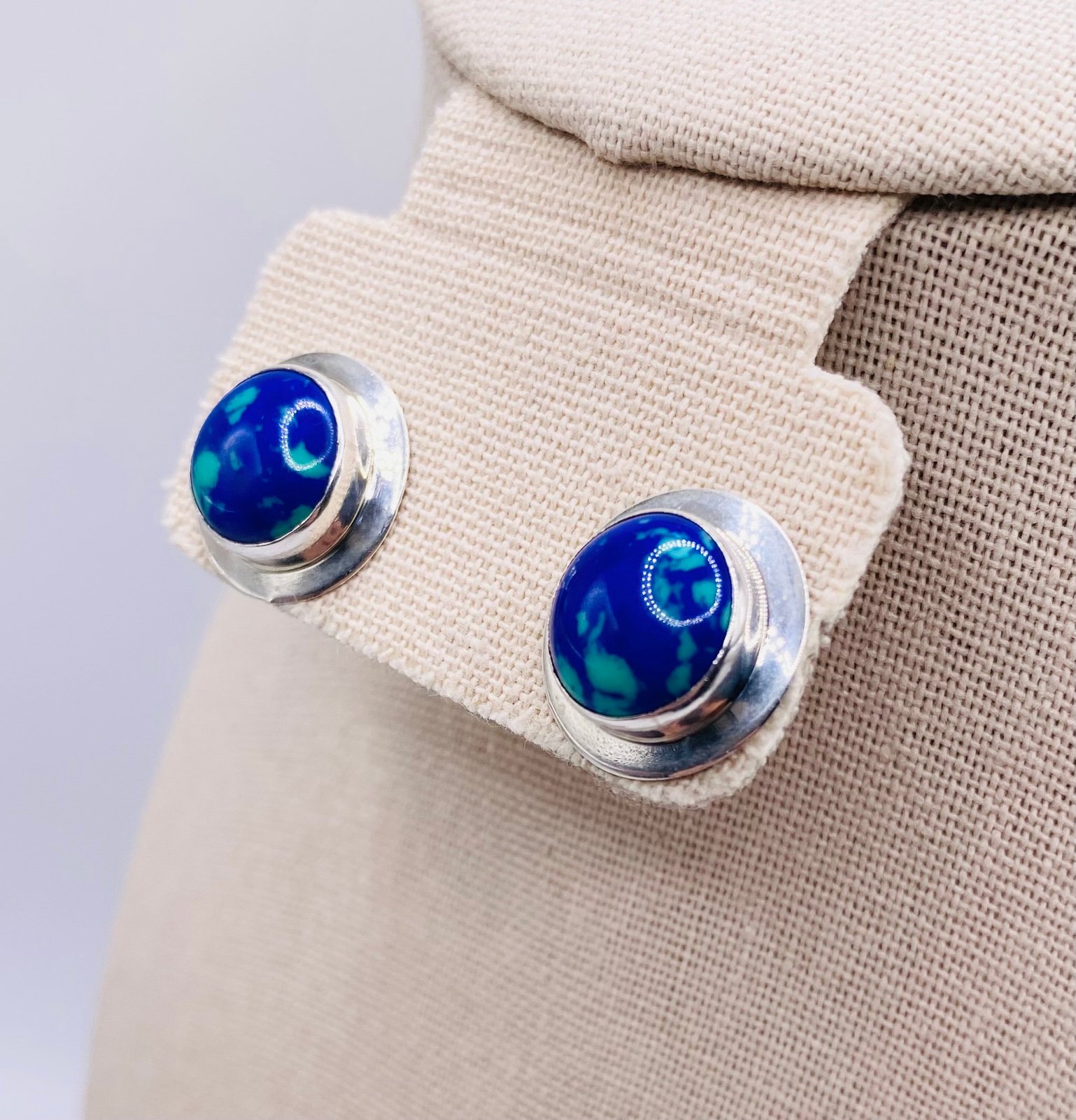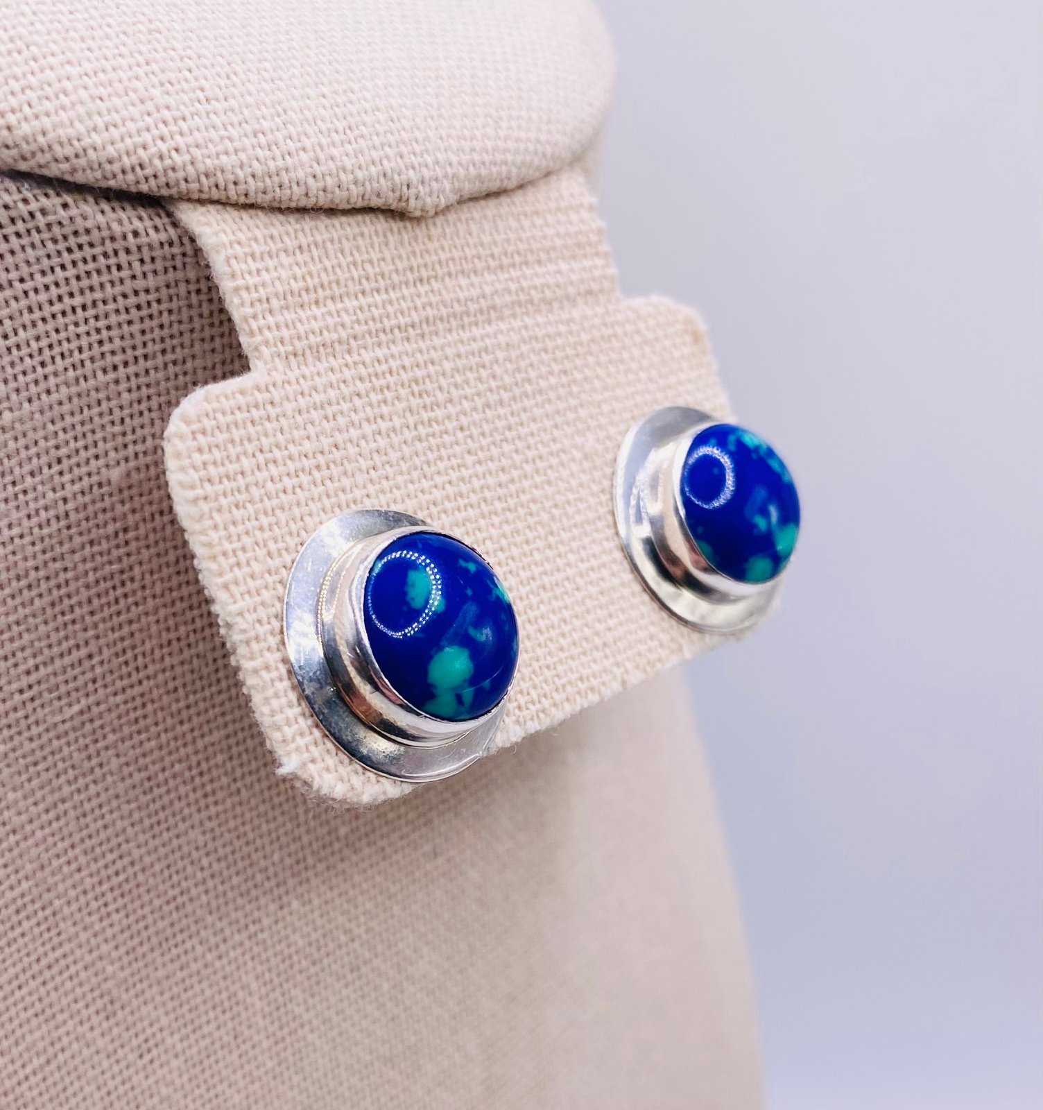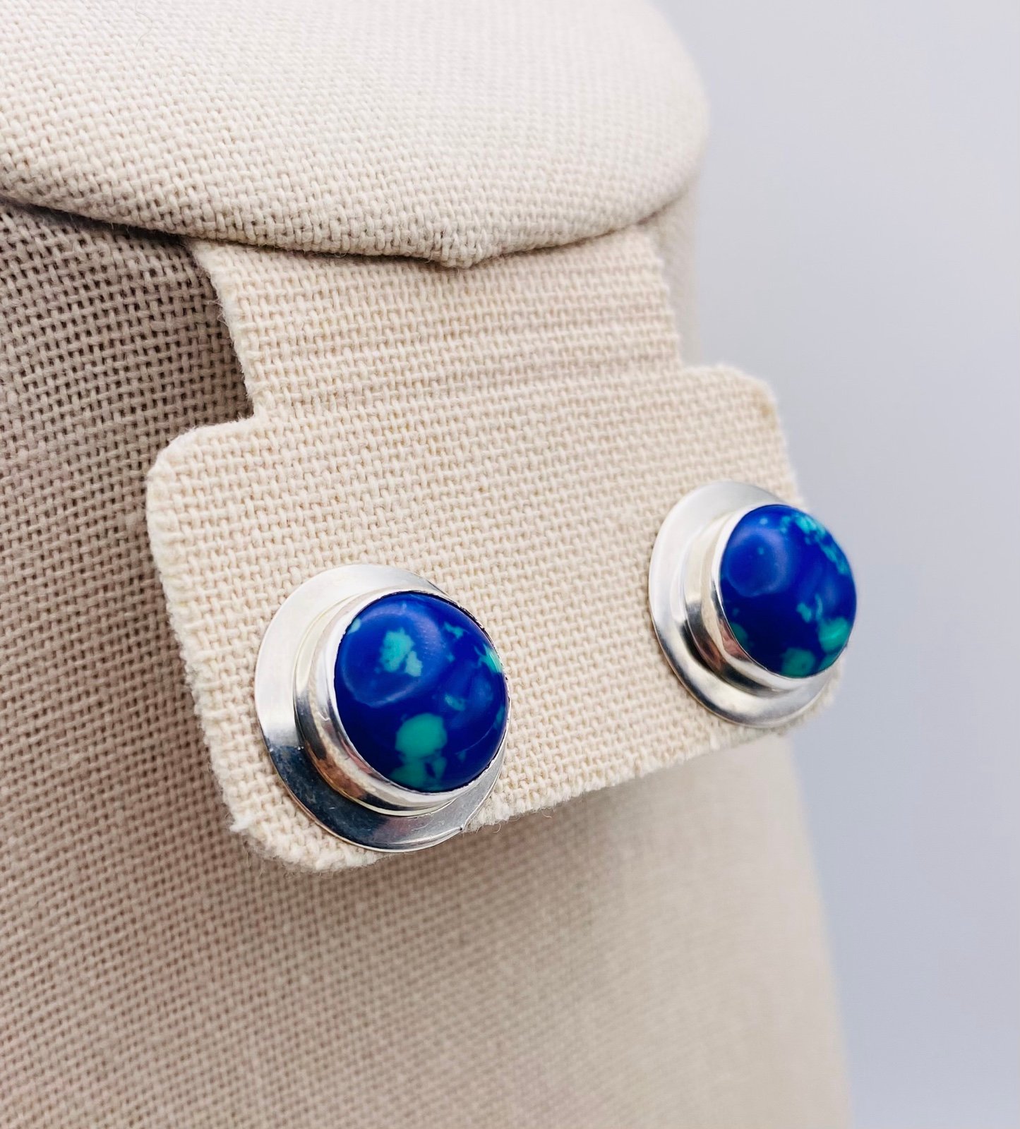 Artisan Signed Inca Zaranda Azurite Malachite Sterling Silver Shield Earrings